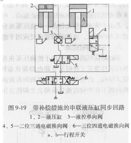 圖9-20b回路則用伺服閥直接控制兩個缸的同步動作。用伺服閥的同路同步精度高,價格昂貴。也可用比例閻代替伺服閥,使之價格降低,但同步精度也相應降低。
