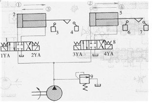 8一換向閥2、5一液壓缸3、4、6、7一行程開關9-溢流閩
