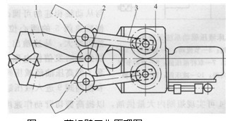 剪切臂相當(dāng)于一個(gè)單自由度回轉(zhuǎn)坐標(biāo)形擺動(dòng)機(jī)械手,其工作原理如圖3所示。裝有軸承的兩個(gè)剪切臂1安裝在主軸2上下兩部分,主軸組件固定在圖9-2中的安裝架4上,主軸上部通過支架裝在復(fù)合安裝板上,圓柱向心推力滾子軸承承受剪切臂部件的軸向載荷并使剪切臂擺動(dòng)自由。曲柄連桿機(jī)構(gòu)3帶動(dòng)剪切壁擺動(dòng),轉(zhuǎn)動(dòng)力矩來自傳動(dòng)箱4。傳動(dòng)箱安裝在機(jī)身軸的安裝架上,箱內(nèi)有兩根軸,主動(dòng)軸下端通過聯(lián)軸器與液壓馬達(dá)相連,主動(dòng)軸上端與曲柄相連。主動(dòng)軸通過一對相互嚙合的直齒輪將運(yùn)動(dòng)傳遞給從動(dòng)軸上端部的另一個(gè)剪切臂。液壓馬達(dá)轉(zhuǎn)動(dòng)時(shí),便可完成一對剪切臂的擺動(dòng)。剪切臂末端固定著兩把剪切刀片,當(dāng)兩個(gè)剪切臂協(xié)動(dòng)時(shí),即可將黏性液流剪切成料滴。