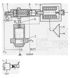 i-比例電磁鐵2-主閥心3、6-不可調(diào)節(jié)流閥4-先導(dǎo)閥心5一壓力反饋推桿