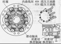 如圖所示,馬達(dá)旋轉(zhuǎn)缸體帶8個(gè)柱塞,內(nèi)曲線環(huán)由6個(gè)作用段組成。馬達(dá)柱塞上滾輪受來(lái)自于泵的壓力油作用,沿定子內(nèi)曲線環(huán)運(yùn)動(dòng)進(jìn)而完成馬達(dá)吸/排油,實(shí)現(xiàn)泵側(cè)的輸出液壓能轉(zhuǎn)換為馬達(dá)側(cè)的輸出轉(zhuǎn)矩。