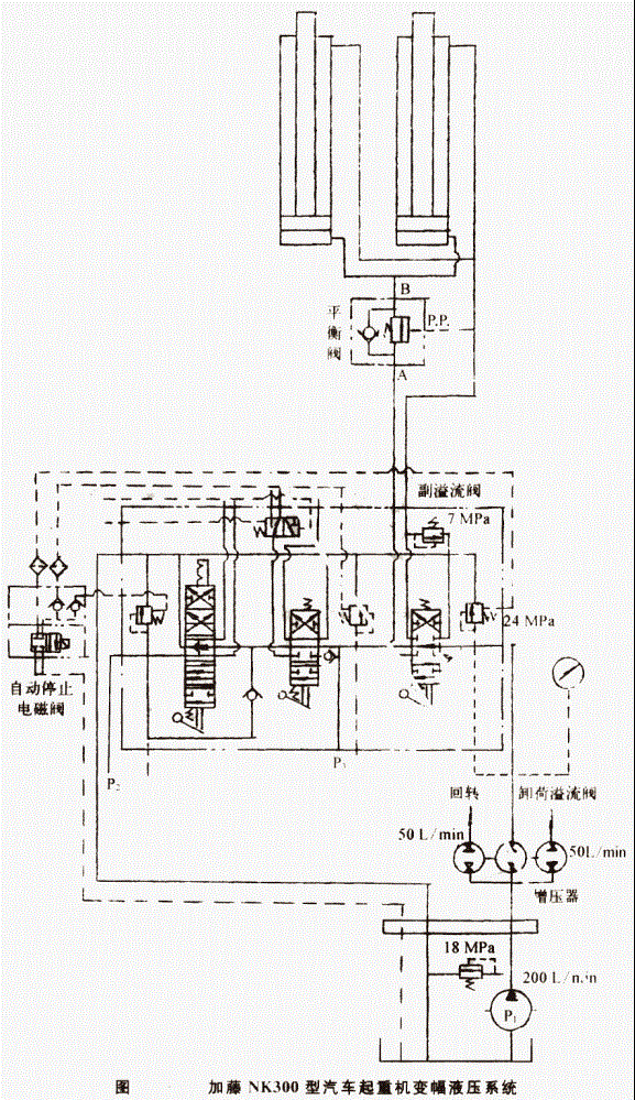 下圖所示是加藤NK300型汽車起重機(jī)變幅液壓系統(tǒng),由兩個(gè)后推式雙作用油缸、平衡閥、主副溢流閥和三聯(lián)控制閥的右聯(lián)閥組成。