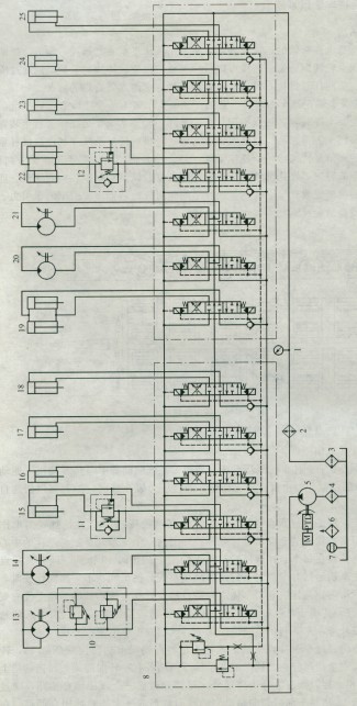 圖2所示為該修補(bǔ)車的電液比例控制液壓系統(tǒng)原理圖。系統(tǒng)由定量葉片泵5(由汽車發(fā)動(dòng)機(jī)經(jīng)變速箱的取力器驅(qū)動(dòng))供油。系統(tǒng)的執(zhí)行器有整車的行走驅(qū)動(dòng)和轉(zhuǎn)向液壓馬達(dá)13和14,壓路機(jī)抬舉液壓缸15,料倉(cāng)門液壓缸16,粑爪液壓缸17、18,廢料箱液壓缸19(2個(gè))、螺旋輸送液壓馬達(dá)20、21,加熱板傾斜(2個(gè))、橫移、升降、旋轉(zhuǎn)液壓缸22~25,共計(jì)13種動(dòng)作功能的15個(gè)執(zhí)行器。這些執(zhí)行器分歸并為兩組并分別采用一組多路換向閥控制,即執(zhí)行器13~18由左側(cè)的多路換向閥8控制,執(zhí)行器19~25由右側(cè)的多路換向閥9控制。兩組多路換向閥均為帶有流量調(diào)節(jié)功能的三位六通電液比例換向閥并采用并聯(lián)油路(各換向閥進(jìn)油口與總的壓力油路相連,各回油口與總的回油口相連),在實(shí)現(xiàn)方向控制的同時(shí),可以實(shí)現(xiàn)各執(zhí)行器的調(diào)速和幾個(gè)執(zhí)行器的同時(shí)動(dòng)作,而閥8中設(shè)置的溢流閥則用于設(shè)定系統(tǒng)的工作壓力,實(shí)現(xiàn)安全保護(hù);液壓泵可以經(jīng)各換向閥的中位油路卸荷;4個(gè)液壓馬達(dá)可通過(guò)其換向閥的Y型機(jī)能的中位進(jìn)行補(bǔ)油,以防馬達(dá)制動(dòng)時(shí)吸空。行走驅(qū)動(dòng)馬達(dá)1 3油路設(shè)有溢流閥組10,用于該馬達(dá)的雙向制動(dòng)緩沖;立置的壓路機(jī)抬舉缸1 5和加熱板傾斜液缸22采用單向順序閥1 1、12作平衡閥用,以實(shí)現(xiàn)缸的位置鎖定和下降限速。系統(tǒng)設(shè)有回油冷卻器和回油過(guò)濾器,用于系統(tǒng)油液散熱和過(guò)濾。