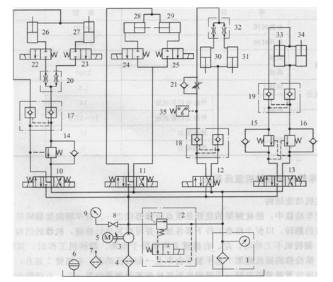 1)該機(jī)的液壓系統(tǒng)采用變量泵供油,液壓馬達(dá)和液壓缸回路分別控制和動作,泵的流量和最高工作壓力按液壓缸的負(fù)載壓力和流量確定,液壓馬達(dá)的工作壓力通過減壓閥調(diào)節(jié)和保持恒定。系統(tǒng)等待期間,液壓泵可以卸荷,有利于減小功率損失和發(fā)熱。