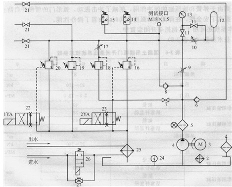 1-通氣過濾器;2-加熱器, 3-雙速電動機14定量液壓泵;5帶樗染指示精過濾器; 6、8單向閥;7、11、21截止閥,9、10、17 -節(jié)流周;12蓄能器;13壓力表; 14、15壓力繼電器;16、20先導式溢流閥l 18、19 -溢流閥;22、23二位四通電磁換向閥;24電接觸式溫度計;25水冷卻器;26二位二通電磁水閥;27水截止閥