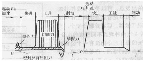 對液壓系統(tǒng)進行工況分析,就是要查日爿它的每個執(zhí)行元件在各自工作過程中的運動速度和負載的變化規(guī)律,這是滿足主機規(guī)定的動作要求和承載能力所必需具備的。液壓系統(tǒng)承受的負載可由主機的規(guī)格規(guī)定,可由樣機通過實驗測定,也可以由理論分析確定。當用理論分析確定系統(tǒng)的實際負載時,必須仔細考慮它所有的組成項目,例如:工作負載(切削力、擠壓力、彈性塑性變形抗力、重力等)、慣性負載和阻力負載(摩擦力、背壓力)等,并把它們繪制成圖,如圖11-2a所示。同樣地,液壓執(zhí)行元件在各動作階段內(nèi)的運動速度也須相應(yīng)地繪制成圖,如圖11-2b所示。設(shè)計簡單的液壓系統(tǒng)時,這兩種圖可以省略不畫。