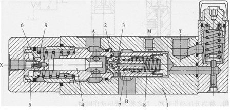 圖6-33所示為在工程機(jī)械領(lǐng)域得到廣泛應(yīng)用的一種平衡閥結(jié)構(gòu)。重物下降時(shí)的油流方向為B-÷A,X為控制油口。當(dāng)沒有輸入控制油時(shí),由重物形成的壓力油作用在錐閥2上,B口與A口不通,重物被鎖定。當(dāng)輸入控制油時(shí),推動(dòng)活塞4右移,先頂開錐閥2內(nèi)部的先導(dǎo)錐閥3。由于閥3右移,切斷了彈簧8所在容腔與B口高壓腔的通路,該腔快速卸壓。此時(shí),B口還未與A口溝通。當(dāng)活塞4右移至其右端面與錐閥2端面接觸時(shí),其左端圓盤正好與活塞附件5接觸形成一個(gè)組件,并在控制油作用下壓縮彈簧9繼續(xù)右移,打開錐閥2,B口與A口相通,其通流截面依靠閥套7上幾排小孔來逐漸增大,從而起到了很好的平衡阻尼作用?;钊?左端中心部分還配置了一套阻尼組件6。這樣,平衡閥在反向通油時(shí)就比較平穩(wěn)。