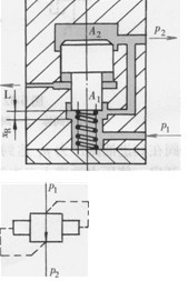 定差減壓閥和定比減壓閥主要用來和其他閥組成組合閥,如定差減壓閥可保證節(jié)流閥進(jìn)出口間的壓差維持恒定,這種減壓閥和節(jié)流閥串聯(lián)連接組成的調(diào)速閥,其工作原理將在后面提及。圖6-31所示為定比減壓閥的結(jié)構(gòu)原理圖。定比減壓閥的進(jìn)口壓力和出口壓力之比維持恒定。
