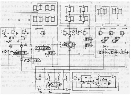 圖2為板帶軋鋼機(jī)彎輥及平衡裝置液壓系統(tǒng)圖。由于軋機(jī)在不同操作狀態(tài)時(shí)需要不同的油壓,經(jīng)過(guò)管1.2供給彎輥的壓力為24MPa,經(jīng)過(guò)管1.3供給平衡缸的壓力為18MPa;經(jīng)過(guò)管14供給換輥所需油壓為6MPa;經(jīng)過(guò)管1.5供給液壓缸的背壓為0.5MPa。分級(jí)調(diào)壓油路單元1可以提供這四種油壓,其中電液伺服壓力閥1.1對(duì)18MPa級(jí)的壓力可進(jìn)行控制。2為油源單元,四臺(tái)液壓泵中的泵2.1可以作為油箱內(nèi)部?jī)艋h(huán)用。3為正彎輥(也可作工作輥平衡)液壓缸組,每個(gè)工作輥在一側(cè)機(jī)架上有兩個(gè)正彎輥液壓缸,總計(jì)有8個(gè)。上工作輥正彎輥液壓缸的無(wú)桿腔引出兩條油路9、10;下工作輥四個(gè)正彎輥液壓缸的無(wú)桿腔共同引出一條油路11;八個(gè)正彎輥液壓缸的有桿腔共同引出一條油路12。正彎輥控制油路單元4對(duì)正彎輥液壓缸組3進(jìn)行控制,其所有的閥處于相應(yīng)的工作狀態(tài)時(shí)可以完成下述工作要求:①正彎輥上作時(shí),油路12通過(guò)4.2接通0.5MPa油壓,形成液壓缸的背壓;油路9、10、11并聯(lián),通過(guò)電液伺服壓力閥4.1接通24MPa油源,根據(jù)正彎輥的電信號(hào)對(duì)電液伺服壓力閥的輸出壓力進(jìn)行控制,從而控制正彎輥的彎輥力;②上、下正彎輥同時(shí)進(jìn)入平衡狀態(tài)工作時(shí),油路12仍接通0.5 MPa油壓,油路9、10、11并聯(lián)通過(guò)閥4.3接通18MPa油壓,平衡壓力由電液伺服壓力閥1.1進(jìn)行控制。只要求上工作輥進(jìn)人平衡工作狀態(tài)時(shí),則油路9、10并聯(lián),通過(guò)閥4.4接通18MPa油壓;③換輥工作狀態(tài)時(shí),油路9、10、Il并聯(lián)通過(guò)閥4.4接通油箱,油路12通過(guò)閥4.2接通6MPa油壓,使八個(gè)止彎輥液壓缸的活塞桿全部縮回;④穿帶工作狀態(tài)時(shí),油路12通過(guò)閥4.2接通0.5MPa油壓,油路9、10、11并聯(lián),同時(shí)與輸出壓力調(diào)定在0.5MPa的電液伺服壓力閥4 1接通。5為負(fù)彎輥液壓缸組,八個(gè)液壓缸的無(wú)桿腔和有桿腔分別并聯(lián)出二條油路13、14,由負(fù)彎輥控制油路單元6來(lái)控制,其所有閥處于相應(yīng)的工作狀態(tài)時(shí),可以完成下述工作要求:①負(fù)彎輥工作時(shí),油路14通過(guò)閥6.2、6.3接通0.5MPa油壓,形成液壓缸的背壓,油路13通過(guò)電液伺服壓力閥6.1接通24MPa油壓,根據(jù)負(fù)彎輥的電信號(hào)對(duì)輸出壓力進(jìn)行控制,從而控制負(fù)彎輥力的大?。虎趽Q輥時(shí),油路l3通過(guò)閥6.4接通油箱,油路14通過(guò)閥6.2、6.3接通6MPa油壓,使八個(gè)負(fù)彎輥液壓缸的活塞桿全部縮回;③穿帶時(shí),油路14通過(guò)閥6.2、6.3接通0.5MPa油壓,油路13與輸出壓力調(diào)定為0.5MPa的電液伺服壓力閥6.1接通。7為支承輥平衡液壓缸組,四個(gè)液壓缸由平衡油路單元8控制,其所有閥處于相應(yīng)的工作狀態(tài)時(shí),可以完成下述工作要求:①平衡時(shí),15、16油路通過(guò)閥8.4、8.1接通18MPa油壓,油路17通過(guò)閥8.3接通0.5MPa油壓,閥8.2控制液控單向閥8.4可使支承輥鎖緊在任何位置上;②換輥時(shí),管經(jīng)15、16通過(guò)閥8.4、8.1接通油箱,油路17通過(guò)閥8.3接通6MPa油壓,使支承輥液壓缸的活塞桿縮回。