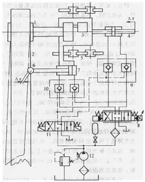 圖3為帶鋼卷取機(jī)跑偏控制裝置原理及液壓系統(tǒng)圖。卷取機(jī)的卷筒1將連續(xù)運(yùn)動(dòng)的帶鋼2卷取成鋼卷,帶鋼在卷取機(jī)前產(chǎn)生隨機(jī)跑偏量△x。卷取機(jī)及其傳動(dòng)裝置安裝在平臺(tái)3上,在主液壓缸4的驅(qū)動(dòng)下平臺(tái)3沿導(dǎo)軌5在卷筒軸線(xiàn)方向產(chǎn)生的軸向位移為△xp。跑偏量△x在跑偏傳感器6感受后產(chǎn)生相應(yīng)的電信號(hào)輸入液壓控制系統(tǒng)使卷筒產(chǎn)生相應(yīng)的位移即糾偏量△xp,使△xp跟蹤△x,以保證卷取鋼卷的邊緣整齊。主液壓缸4和跑偏傳感器液壓缸7都由電液伺服閥8進(jìn)行控制。液控單向閥組9、10及換向閥1l組成轉(zhuǎn)換油路,12為油源。系統(tǒng)投入工作前先使跑偏傳感器液壓缸7與電液伺服閥8相通,使跳偏傳感器自動(dòng)調(diào)零,然后轉(zhuǎn)換油路使主液壓缸4與電液伺服閥8相通,系統(tǒng)投入正常工作。