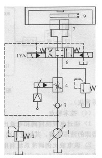 1-限壓式變量液壓泵.2、5一溢流閥;3-單向閥4-電液比例調(diào)速閥; 6一三位四通電液換向閥7-液壓缸;8一磨床工作臺(tái);9-感應(yīng)閘步器