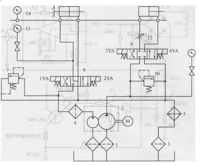 1,3,4-過(guò)濾器;2一雙聯(lián)齒輪泵;5一冷卻器; 6一電液比例壓力閥;7一先導(dǎo)式溢流閥 8、9-三位四通電磁換向閥; 10-溢流閥;11、13,14-壓力表;12-節(jié)流閥; 15-主液壓缸;16-修整液壓缸