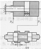 圖6- 40b為雙邊滑閥控制式,它有兩個控制邊。壓力油一路進入液壓缸左腔,另一路經滑閥控制邊戈。,的開口和液壓缸右腔相通,并經控制邊xs2的開口流回油箱。當滑閥移動時,xs1增大,xs1也減小,或相反,這樣就控制了液壓缸右腔的壓力,因而改變了液壓缸的運動速度和方向。