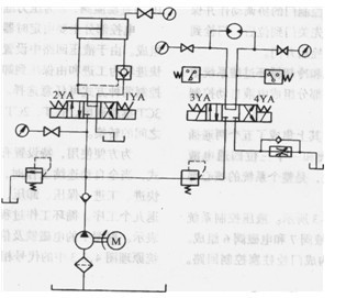 該機液壓系統(tǒng)如圖4.3-1所示。該系統(tǒng)可自動完成從濾板加壓到拉開濾板卸渣的整個工作循環(huán)。當(dāng)電磁鐵1YA通電后,液壓缸活塞桿推出,將濾板壓緊系統(tǒng)壓力升至電接點壓力表設(shè)定值時,觸點發(fā)出信號,1YA斷電,換向閥芯復(fù)位,液控單向閥關(guān)閉,活塞桿被鎖定,濾板保壓進行濁汁濾清。到工藝要求所設(shè)定的時間后,時間繼電器發(fā)出信號,2YA通電使活塞桿退回,壓下行程開關(guān)。3YA通電,液壓馬達正轉(zhuǎn)拉開第一塊濾板到極限位置,油路壓力上升,壓力繼電器發(fā)出信號,3YA斷電,4YA通電,液壓馬達反轉(zhuǎn)回到第二塊濾板處……往復(fù)將濾板依次拉開卸渣后,恢復(fù)到原始狀態(tài),即完成了一個工作循環(huán)。