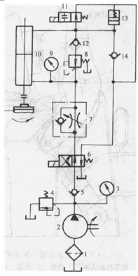 圖4為新型石料磨光機中的磨頭升降液壓系統(tǒng)。電動機啟動后,液壓泵2開始供油,電磁閥6得電后,油液進入液壓缸10上腔,砂輪快速下行。因有閥8和閥7形成的背壓,下行速度不致過快,此時彈簧式蓄能器13放油。當(dāng)砂輪接觸石料板坯后,液壓缸10上腔壓力增加,當(dāng)達到溢流閥4開啟壓力即系統(tǒng)壓力調(diào)定值。砂輪作用于板坯的法向力決定了液壓缸10兩端的壓差。此時蓄能器13充油。若遇到過厚板坯時砂輪被頂起,因有蓄能器13,此時液壓缸上腔壓力不會猛增。如切削力過大,則使液壓泵的驅(qū)動電機的電流過大,利用此電流信號可使閥6失電復(fù)位。則袖液進入液壓缸10下腔,上腔的油液經(jīng)腳ll同油箱。欲使磨頭升起也可使閥6失電,砂輪升起。上升到某一位置需停止時,只需使閥11失電切斷回油路即可,此時蓄能器13起到緩沖作用,使液壓缸10上腔壓力不會過分增加。本液壓系統(tǒng)的工作壓力需調(diào)定在0 9 -1.2MPa之間。
