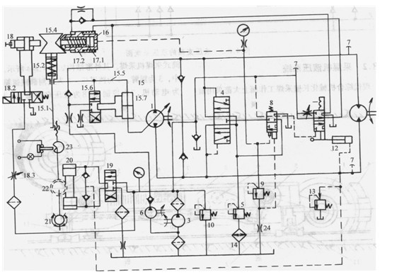 泵位調(diào)節(jié)器15實(shí)際上是一手動伺服變量機(jī)構(gòu),包括調(diào)速桿15.1、大彈簧15.2、彈簧套15.3和V形槽板15.4、反饋杠桿15.5、伺服滑閥15.6和變量活塞15.7。在大彈簧尚未壓縮的自由狀態(tài)下,調(diào)節(jié)器各個(gè)零件所處的位置都對應(yīng)于泵位的零位。搖動手柄21或轉(zhuǎn)動齒輪22,通過絲杠、螺母推動調(diào)速桿上、下移動,便可在任一方向上壓縮大彈簧。假設(shè)其壓縮量為xo,這時(shí)如果開關(guān)活塞16處于右位(解鎖)松開V形槽板,則V形槽板將在大彈簧力的作用下也沿相同的方向(如圖向上或向下)移動x0。位移xo又通過反饋杠桿推動伺服滑閥,從而使變量活塞移動xp。于是主泵便以與此相應(yīng)的方向和排量工作。因此,可以直接利用泵位調(diào)節(jié)器對馬達(dá)進(jìn)行手動調(diào)速和換向。但實(shí)際上只用它作為系統(tǒng)運(yùn)行速度和運(yùn)動方向的給定裝置,而利用液壓恒功率調(diào)節(jié)器和電動機(jī)恒功率調(diào)節(jié)器在給定的速度范圍內(nèi)進(jìn)行自動調(diào)速。