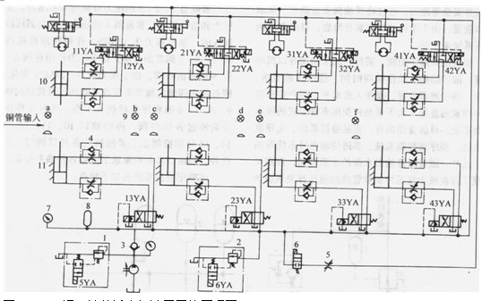某機(jī)的液壓原理如圖4.9-6所示,主要由主機(jī)、液壓站、矯正輥驅(qū)動(dòng)設(shè)備、傳輸裝置及操縱控制臺(tái)組成。