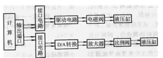 由于林木球果采集作業(yè)對動(dòng)作精度不高,同時(shí)為了降低生產(chǎn)成本,便于推廣應(yīng)用,故采用開環(huán)控制的計(jì)算機(jī)數(shù)字程序控制系統(tǒng)。其控制參數(shù)有6個(gè)電磁換向閥為12個(gè)開關(guān)量,加2個(gè)電磁溢流閥,共14個(gè)開關(guān)量,2個(gè)電液比例調(diào)速閥為兩個(gè)所示。