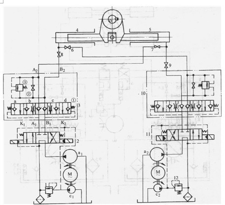 1、12-溢流閥2、11-電液換向閥3、10-限速閥組4、5-液壓缸6、7、8、9一截止閥 a1、a2一泵、cl、c2控制油源