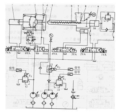 預(yù)塑進(jìn)料:6YA、7YA、9YA、10YA帶電,單泵供油,液壓馬達(dá)回轉(zhuǎn),驅(qū)動螺桿進(jìn)料。