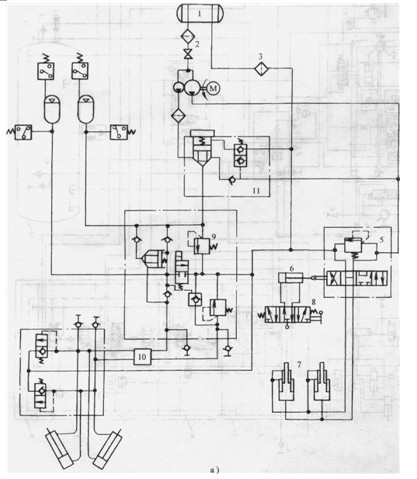 1-油箱2一過(guò)濾器3-回油過(guò)濾器4-泵組5-舉升控制閥6-氣動(dòng)控制缸7-舉升液壓缸8-氣動(dòng)控制閥9-排放閥組IO-轉(zhuǎn)向控制器11-卸荷閥組