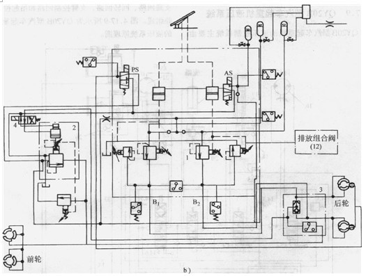 該車有三種制動(dòng)方式,分別為工作制動(dòng)、緊急制動(dòng)和停車制動(dòng)。制動(dòng)踏板控制的是工作制動(dòng);AS電磁閥動(dòng)作時(shí)為緊急制動(dòng)。PS動(dòng)作時(shí),后輪的壓力油被卸荷,由彈簧力驅(qū)動(dòng)停車制動(dòng)。