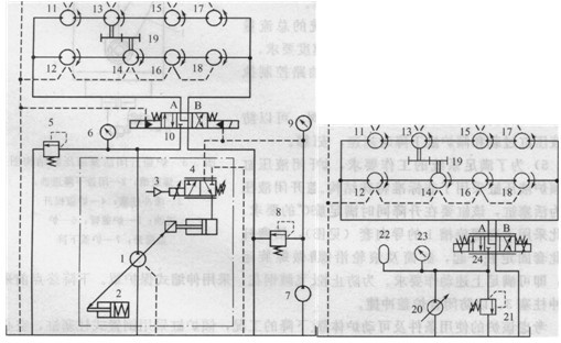 1、2一定量柱塞泵;3、4-單向閥;5、14、15、16-壓力表開(kāi)關(guān);6、17、18、19-壓力表;7、10 -截止閥;8、9-電磁溢流閥;11-泥炮旋轉(zhuǎn)液壓缸;12-壓炮液壓缸;13-打泥液壓缸;20-減壓閥;21、22、23-雙單向節(jié)流閥;24、25、26-雙向液壓鎖;27、28、29-三位四通手動(dòng)換向閥