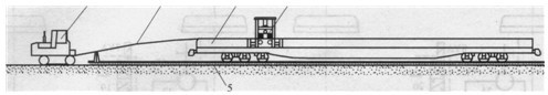 1-鋼軌牽引車;2-待鋪設(shè)鋼軌;3-鋼軌專用平車(小車);4-鋼軌助推器;5-鋪設(shè)的鋼軌