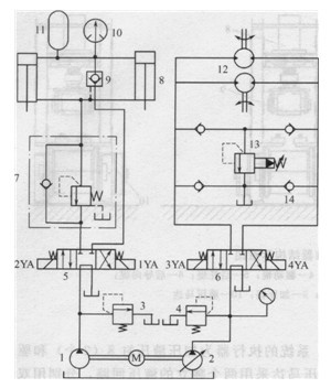 1-定量液壓泵(齒輪泵);2-恒功率變量泵;3、4、13 -溢流閥;5、6-三位四通電磁換向閥;7-單向順序閥;8-加壓液壓缸;9-液控單向閥;10 -電接點壓力表;11-蓄能器; 12-雙向定量液壓馬達(dá);14-單向閥