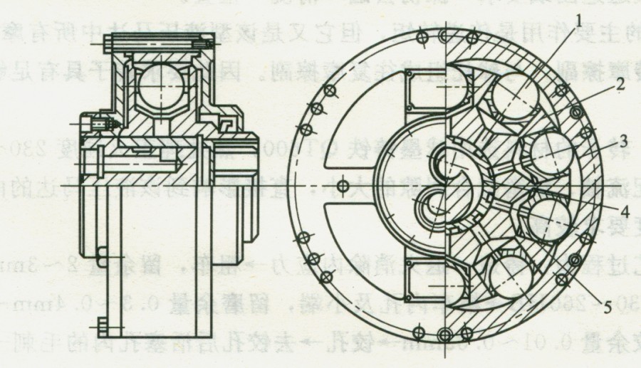 1-內(nèi)曲線定子;2-鋼球;3-球托;4-轉(zhuǎn)子;5-配流軸 定子、轉(zhuǎn)子及配流軸等主要關(guān)鍵零件的材料及工藝直接影響該型馬達(dá)的性能和壽命。