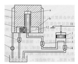 圖1所示為高效液壓千斤頂?shù)南到y(tǒng)原理圖,其手搖泵部分與傳統(tǒng)千斤頂相同,由壓桿11、泵缸2及活塞1、配油機(jī)構(gòu)(吸油單向閥4和壓油單向閥3組成);其頂升缸部分與傳統(tǒng)千斤頂則不同,頂升缸由大小兩個(gè)液壓缸套裝復(fù)合而成,小缸的空心柱塞12與大缸的缸筒9固連,大缸的活塞10兼作小缸的缸筒,活塞 10的下端臺(tái)肩孔內(nèi)的柱塞12上有內(nèi)置單向閥 8,從而形成兩個(gè)作用面積不等的工作腔a、b。 單向閥7置于與b腔和油箱5的管路上,6為下 降截止閥。