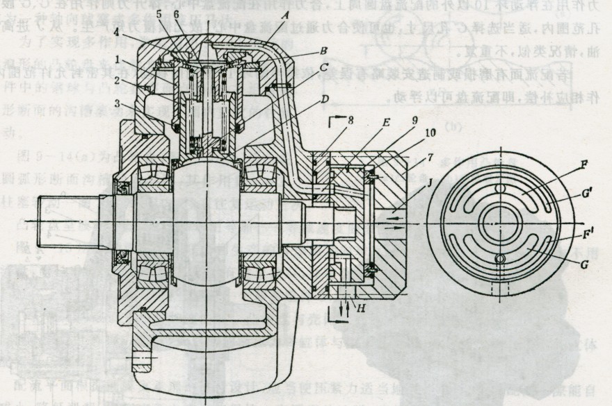 此配流裝置的主要.特點(diǎn)是:配流盤不傾覆,可以浮動。為防止配流盤的傾覆,設(shè)有兩條輔助腰形孔F’、G’,相應(yīng)地與F、G孔相通(圖9 -12中未表示)。若高壓油從孔H進(jìn)入,則液壓壓緊力作用在浮動環(huán)10以外的配流盤圓周上,合力作用在配流盤中心,撐開力則作用在G、G’腰形孔范圍內(nèi),適當(dāng)選擇G’孔尺寸,也可使合力通過配流盤中心,故無傾覆力矩產(chǎn)生。從J進(jìn)高壓油,情況類似,不重復(fù)。