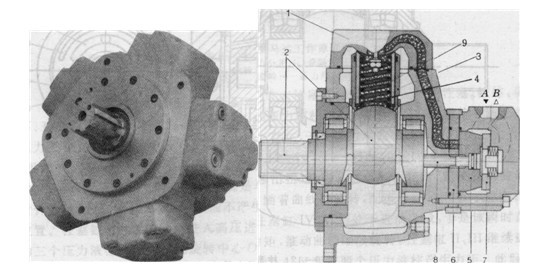 1-缸蓋;2-偏心軸;3-缸套;4-柱塞;5-配流盤;6一配流隔順; 7一浮動環(huán);8-十字滑塊軸端;9-彈簧