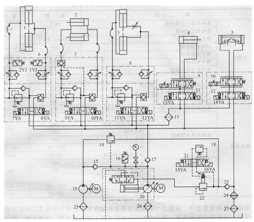 1-頂鐓央緊液壓缸;2-收緊液壓缸;3-彎管模液壓缸;4一頂鐓液壓缸; 5-齒輪齒條式彎曲液壓缸;6、7、8缸1、2、3的液壓閥油路;9、10電赦伺服閥; 11、12三位四通電液換向閥;13、25、26、27過(guò)濾器;14-遠(yuǎn)控順序閥; 15、17、23-單向閥;16-壓力繼電器;18-遠(yuǎn)程調(diào)壓溢流閥;19-定量液壓泵;