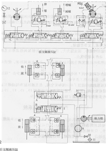 2多蹄閥3安全閥4-雙向被壓鎖5、6、8-平衡閥7-單向節(jié)流閥9-中心回轉(zhuǎn)接頭10-fl關(guān)11-過濾器12-壓力表