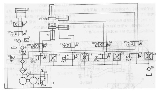圖3示為雙泵供油系統(tǒng),低壓大流量泵2排油經(jīng)單向閥5與高壓小流量泵l排油匯合一處,經(jīng)過濾器6、單向閥7向系統(tǒng)各運(yùn)動機(jī)構(gòu)提供壓力油,系統(tǒng)壓力由溢流閥28調(diào)定并保持。