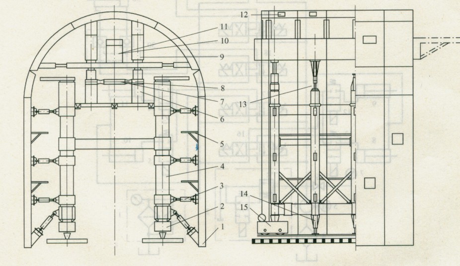 3)水平液壓缸的操作兩個(gè)水平液壓缸35和36由三位四通電磁換向閥18和19的控制,可同時(shí)動(dòng)作,也可單獨(dú)動(dòng)作,完成模板相對(duì)龍門(mén)架左、右平動(dòng),從而實(shí)現(xiàn)模板中心與隧道中心的對(duì)位。