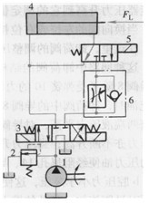 1-液壓泵2-溢流閥3-三位四通電磁換向閥4-液壓缸5-=位三通電磁換向閥 6-單向調速閥