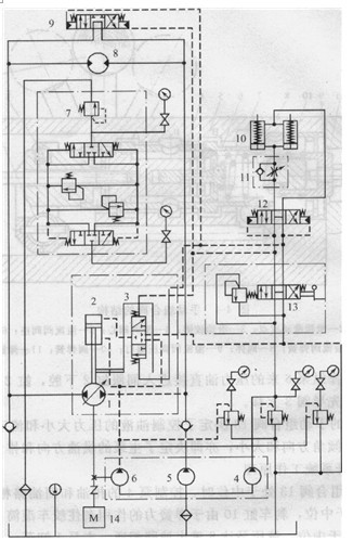 1-雙向伺服變量液壓泵(主泵);2一伺服缸;3一先導(dǎo)閥;4一控制泵;5一補油泵; 6-操縱泵; 7-雙向溢流閥;8-雙向定量液壓馬達(dá);9、12-三位四通液動換向閥 10-剎車液壓缸;11-單向液阻器;13-手動組合閥;14-柴油機
