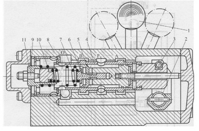 1-操作手柄; 2-滑閥滑動支點;3一滑動鉸鏈;4滑閥閥心;5一溢流閥閥座; 6一溢流閥閥心7溢流閥彈簧;8閥體;9一溢流閥調(diào)壓螺釘;10-閥彈簧;11-彈簧座