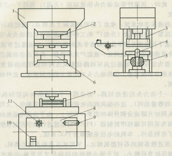 VIS系列墻地磚液壓馬達(dá)系統(tǒng)是我國從意大利引進(jìn)的建材生產(chǎn)設(shè)備,主要用于瓷磚坯的壓制生產(chǎn)。該系列壓機有800、1000、1200、1500、2000等幾種不同規(guī)格型式,其結(jié)構(gòu)和液壓系統(tǒng)有很多類同之處,現(xiàn)以VIS800型液壓機為例,著重介紹其液壓系統(tǒng)的工作原理和技術(shù)特點。該機由主機、液壓馬達(dá)系統(tǒng)和電控系統(tǒng)組成,其主機(見圖1)由機體,模具(上模和下模),保證上、下橫在壓制過程中的對心的滑塊導(dǎo)桿,用于排氣的橡膠柱、頂桿,送料裝置(推板)等組成。工作時,送料裝置7將陶瓷粉料送至下模腔中,然后上模下降,進(jìn)行壓制加工。上、下模模腔可根據(jù)所生產(chǎn)的瓷磚規(guī)格進(jìn)行更換。