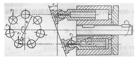 當(dāng)壓力油以壓力p進(jìn)入馬達(dá)的高壓腔后,馬達(dá)的另一接口連通低壓油道(油箱等),當(dāng)柱塞截面積為A時(shí),滑靴受到p·A的作用力壓向斜盤(pán),其反作用力為F。F力分解成兩個(gè)分力,分力Fp沿柱塞軸線向右,與柱塞所受液壓力平衡,另一個(gè)分力FT與柱塞軸線垂直向上,這個(gè)垂直分力FT使處于壓油區(qū)的每個(gè)柱塞都對(duì)轉(zhuǎn)子中心產(chǎn)生一個(gè)轉(zhuǎn)矩,這些轉(zhuǎn)矩的總和使缸驅(qū)動(dòng)液壓馬達(dá)旋轉(zhuǎn)作功。
